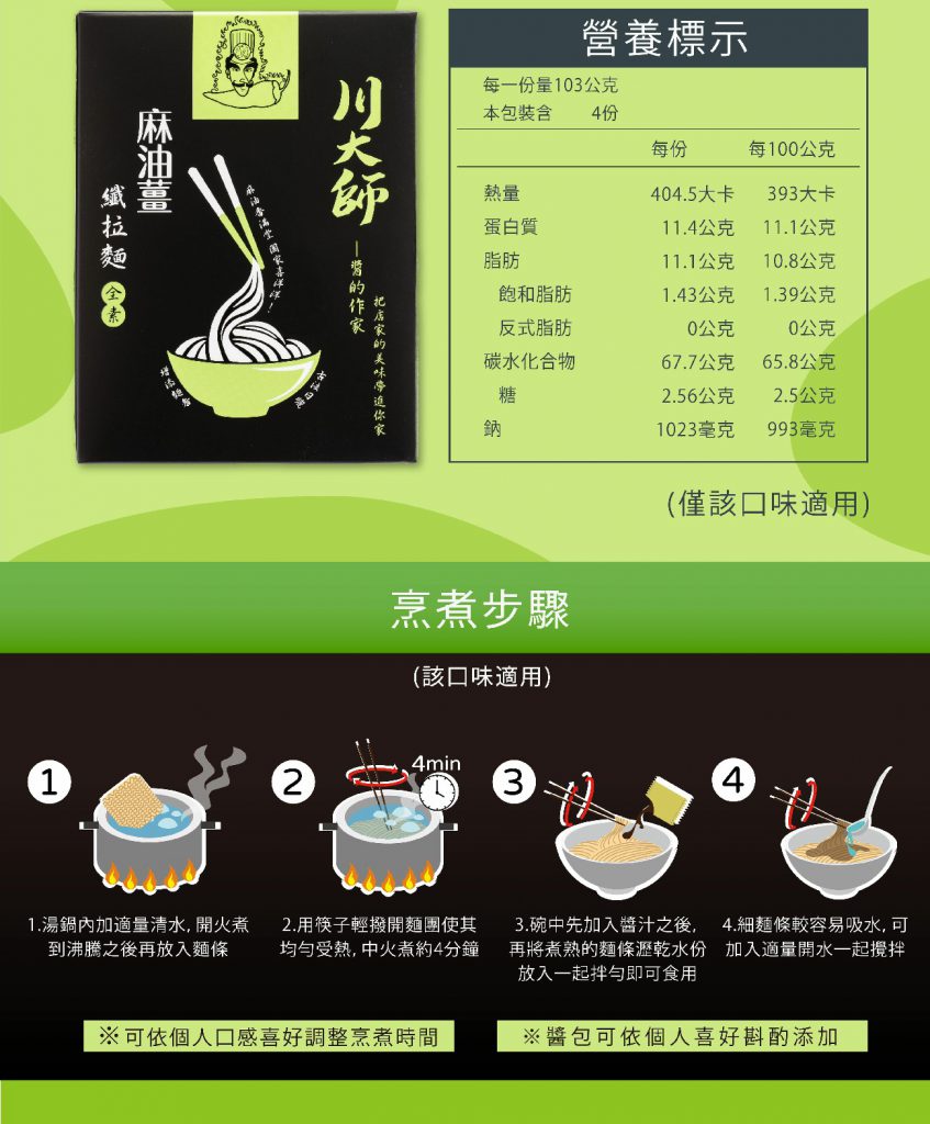 注意事項:產品內醬料包若發現破損或膨包現象切勿食用,請致電公司服務專線處理。